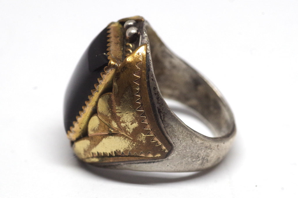 This heavy duty ring made from gold on silver and featuring an onyx stone is a statement piece for your hand, whether you're trying to impress your friends or intimidate your rivals.