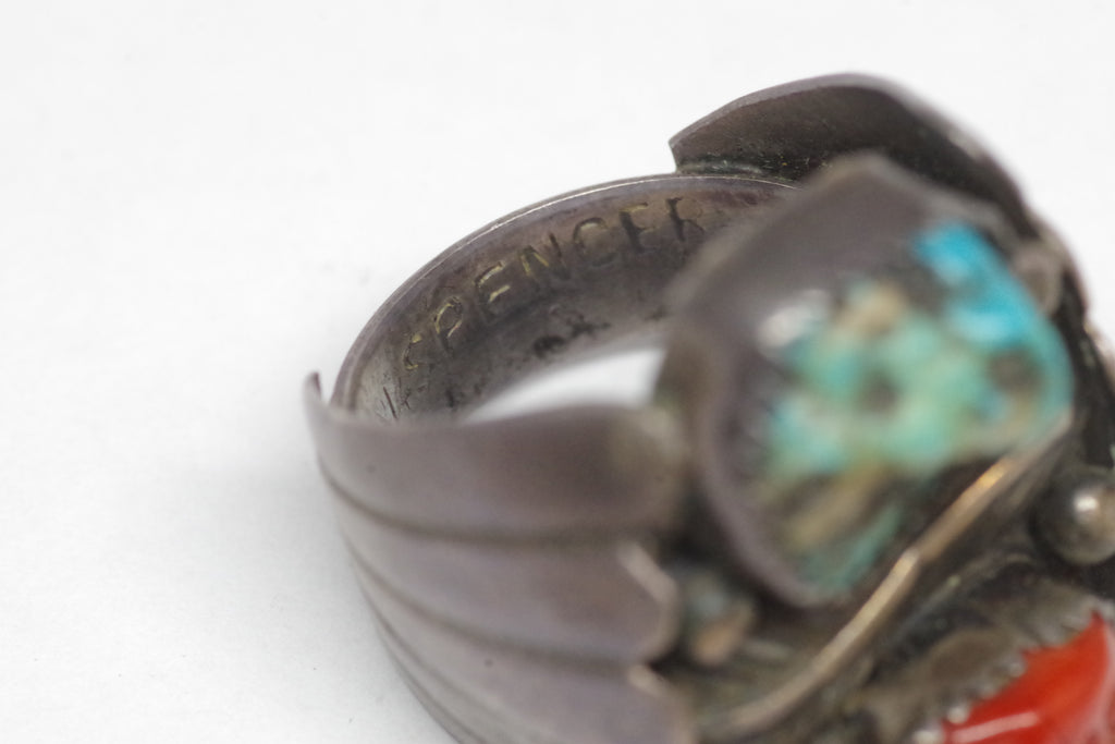 With a classic turquoise and coral combo, this silver ring is a major pop of Southwestern color for your hand. Signed by artist "Spencer" on the band.