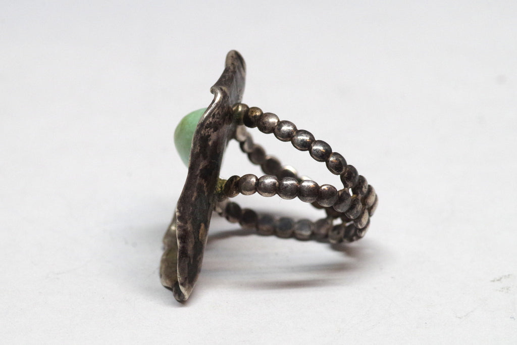 This beautiful, lightweight bit of silver features the classic Southwestern stone combo of turquoise and coral. The style and techniques used to make this ring lead us to believe it is Navajo but it is unsigned.