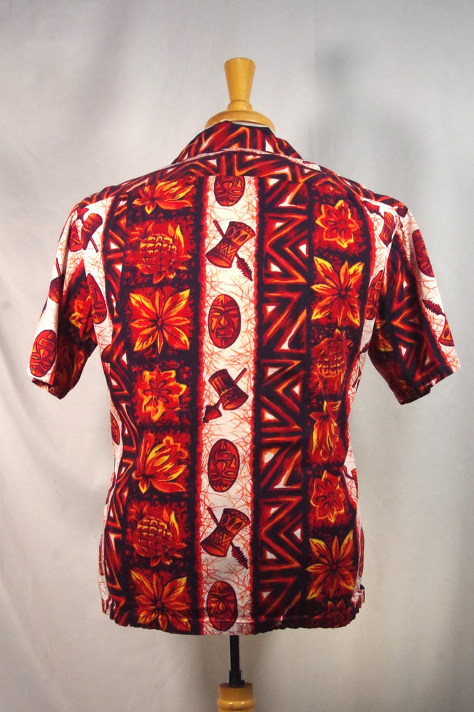 When it comes to aloha shirts, go for the real deal with this vibrant red cotton number, featuring pineapples, hibiscus, ceremonial drums and tribal masks.