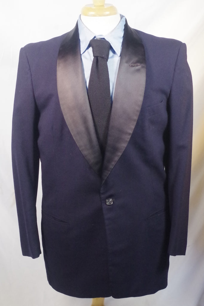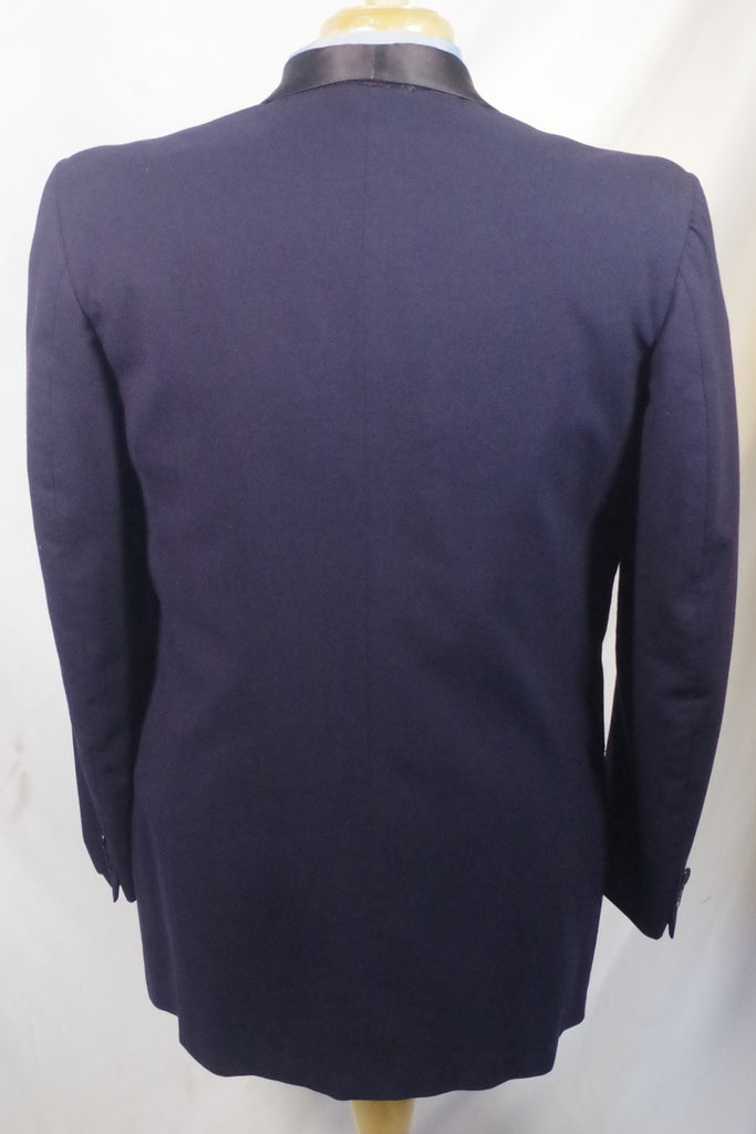Stroll into the charity dinner with panache wearing this navy blue tuxedo, featuring black satin lapels and a gorgeous mahogany satin piping on the pants.