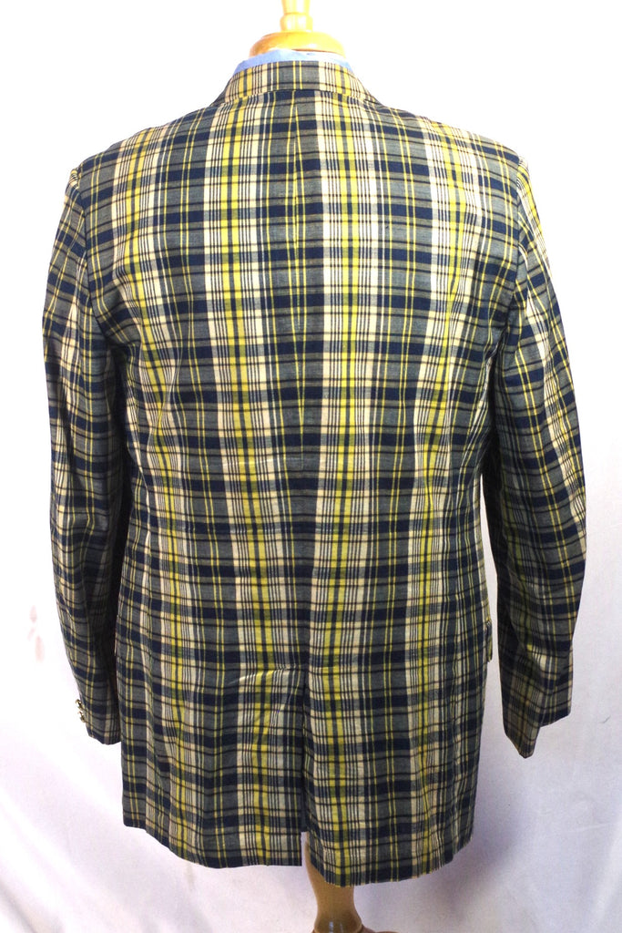 This amazing madras sport coat from Ireland with three-button closure and a single vent features a bold blue and yellow pattern and is perfect for those hotter days where you still want to look beautifully layered.